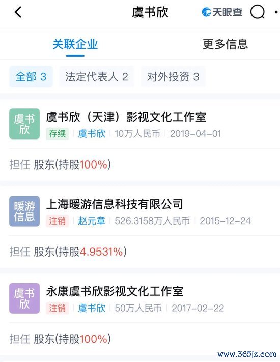 天眼查信息显示,虞书欣关联3家公司,仅虞书欣(天津)影视文化工作室存续,虞书欣担任投资人持股100%。