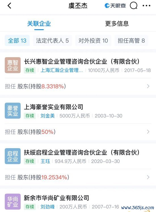 其父亲虞丕杰名下关联12家公司,4家为存续状态,其中持有涉争议的新余市华尚矿业有限公司48%股权,并担任总经理。虞书欣母亲刘金美名下关联7家公司,多家为吊销状态,仅1家存续。
